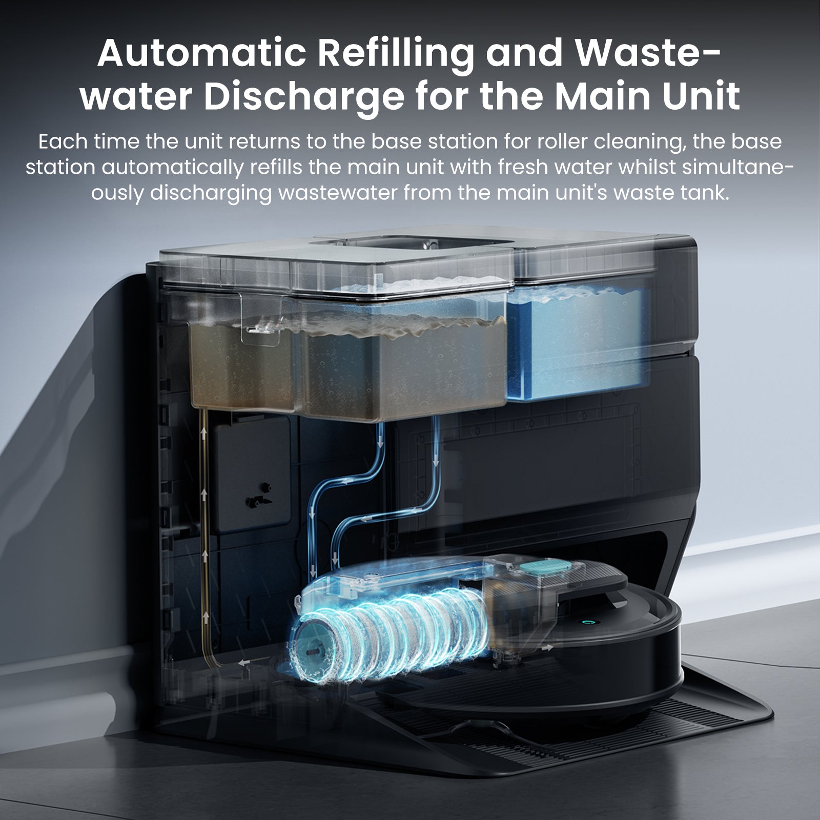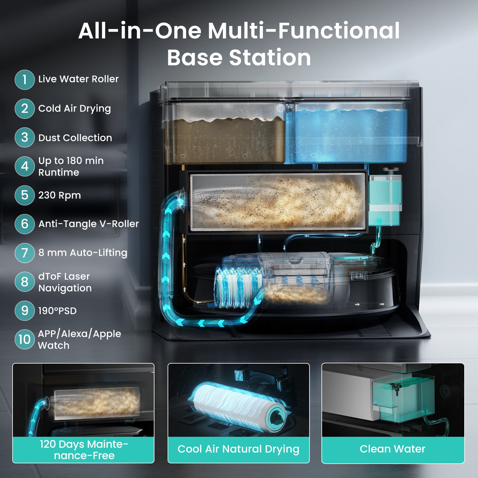 - 【All-in-One Self-Cleaning Base Station】The M5 Pro's intelligent base station completely automates maintenance: auto-empties dust into a 120-day capacity bag, washes the mop with 167°F hot water during cleaning, air-dries it to prevent odors, and auto-refills water for uninterrupted mopping up to 3444 sq ft. App-selectable drying time offers flexibility.