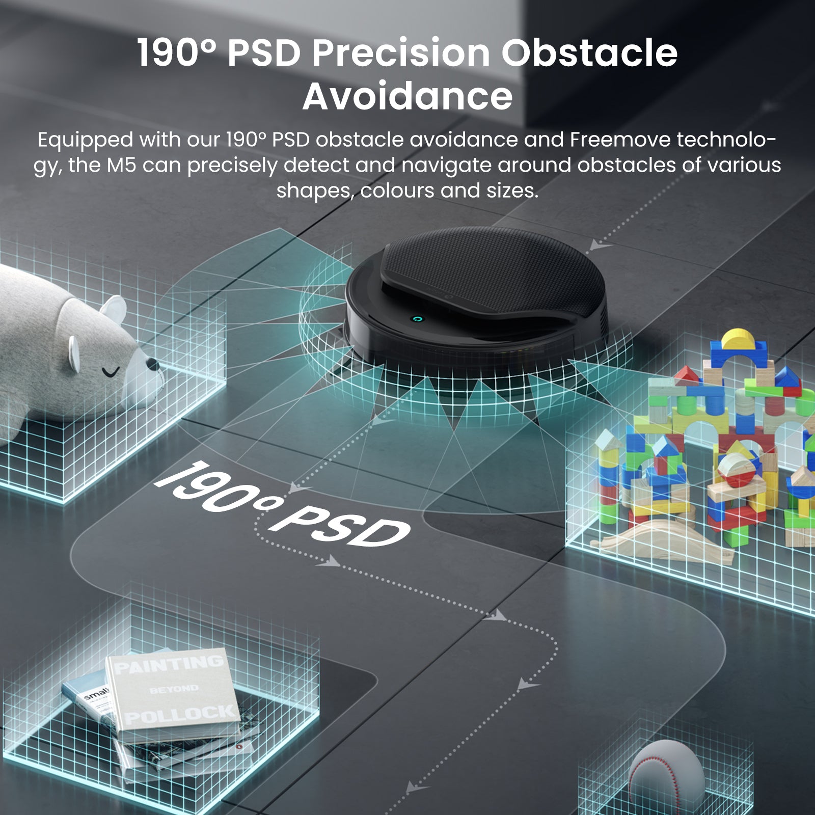 - 【PSD 2.0 Smart Obstacle Avoidance & Slim Body】Upgraded PSD 2.0 system with 190° wide-angle detection recognizes and precisely bypasses shorter obstacles without blind spots. Compact 12.6-inch body easily cleans under furniture, eliminating manual intervention.